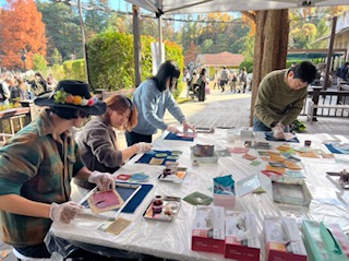 ムーミンバレーパークは、ムーミン物語の世界が再現されている自然豊かな湖畔の美しいテーマパークで、ちょうど紅葉とクリスマスムードたっぷりの季節に、3日間で合計約100名の方に型染を体験していただきました。